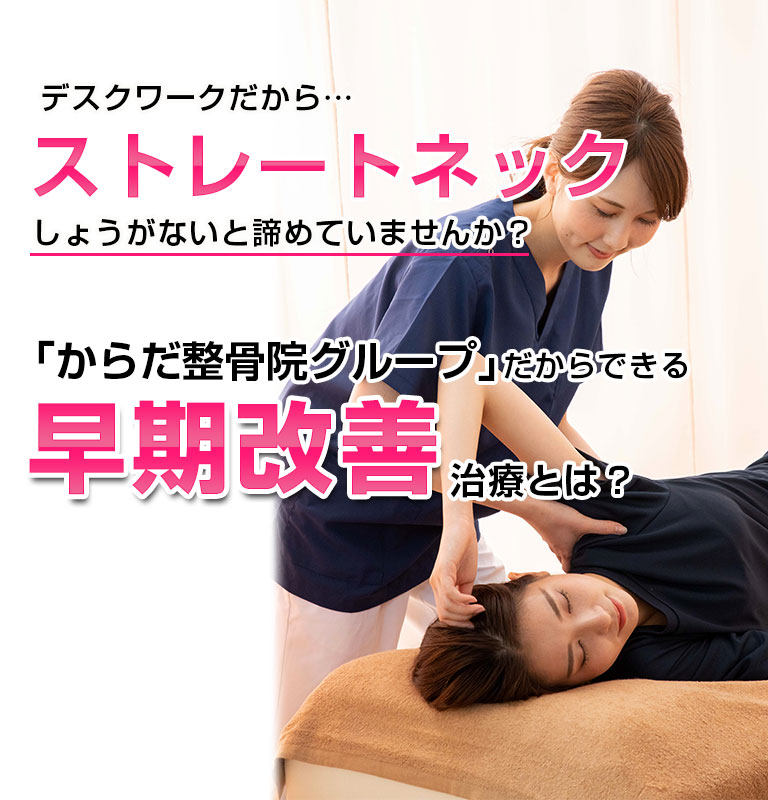 ストレートネックとは「頸椎と呼ばれる首の骨のカーブが失われまっすぐになっている」状態で、最近では「スマホ首」とも呼ばれています。